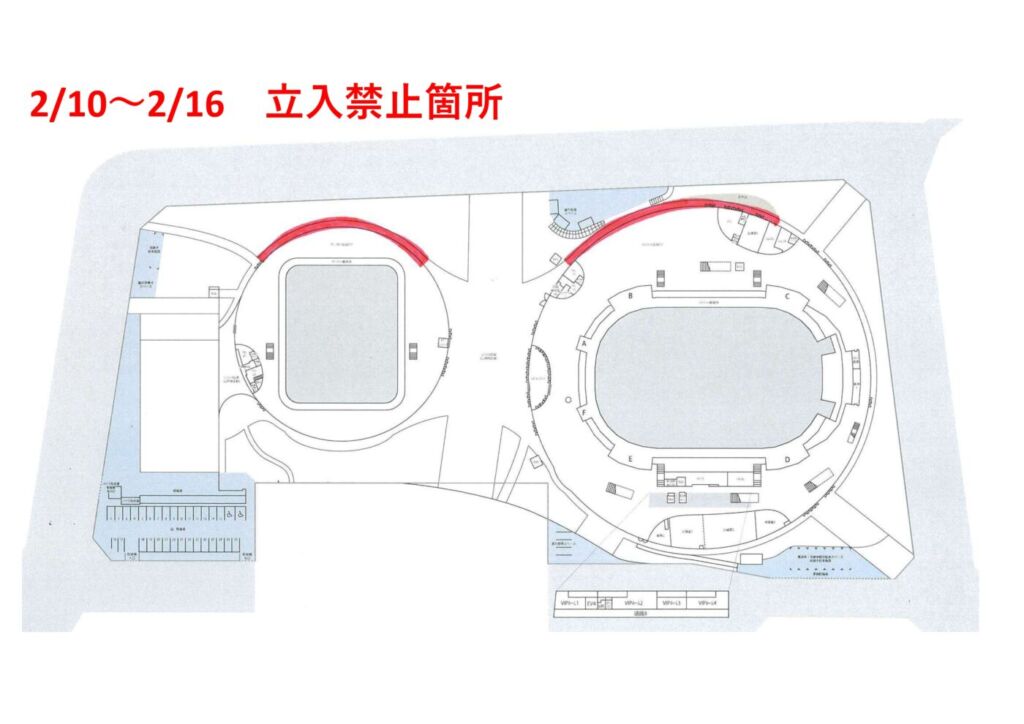 プロジェクションマッピング準備のため、2月10日(火)より2月16日(月)までの7日間、メインアリーナおよびサブアリーナの、外構部(犬走り)の北側が、終日立入禁止になります。