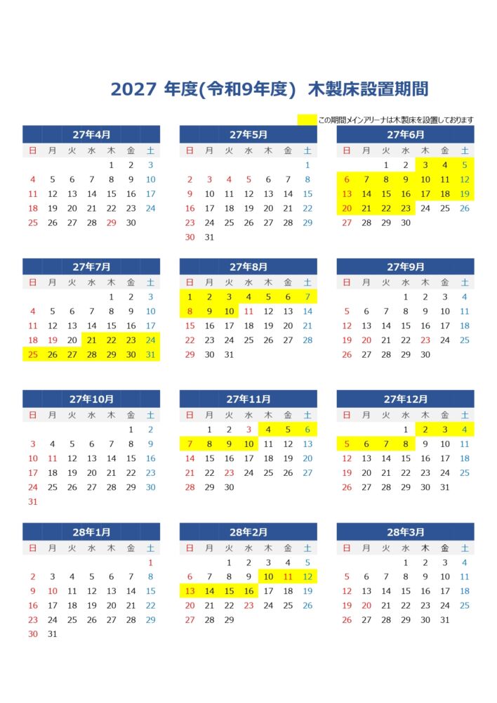 設置期間は、以下木製床設置期間年間カレンダーよりご確認ください。